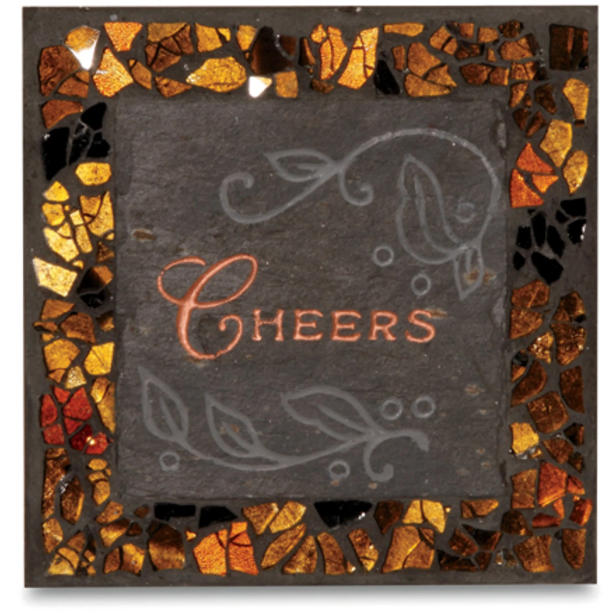- IN-HOUSE DESIGN: "Enjoy Life", "Cheers", "Good Times", "Laughter" texts are engraved onto the front of the coasters, alongside an engraved floral design and a metallic mosaic.